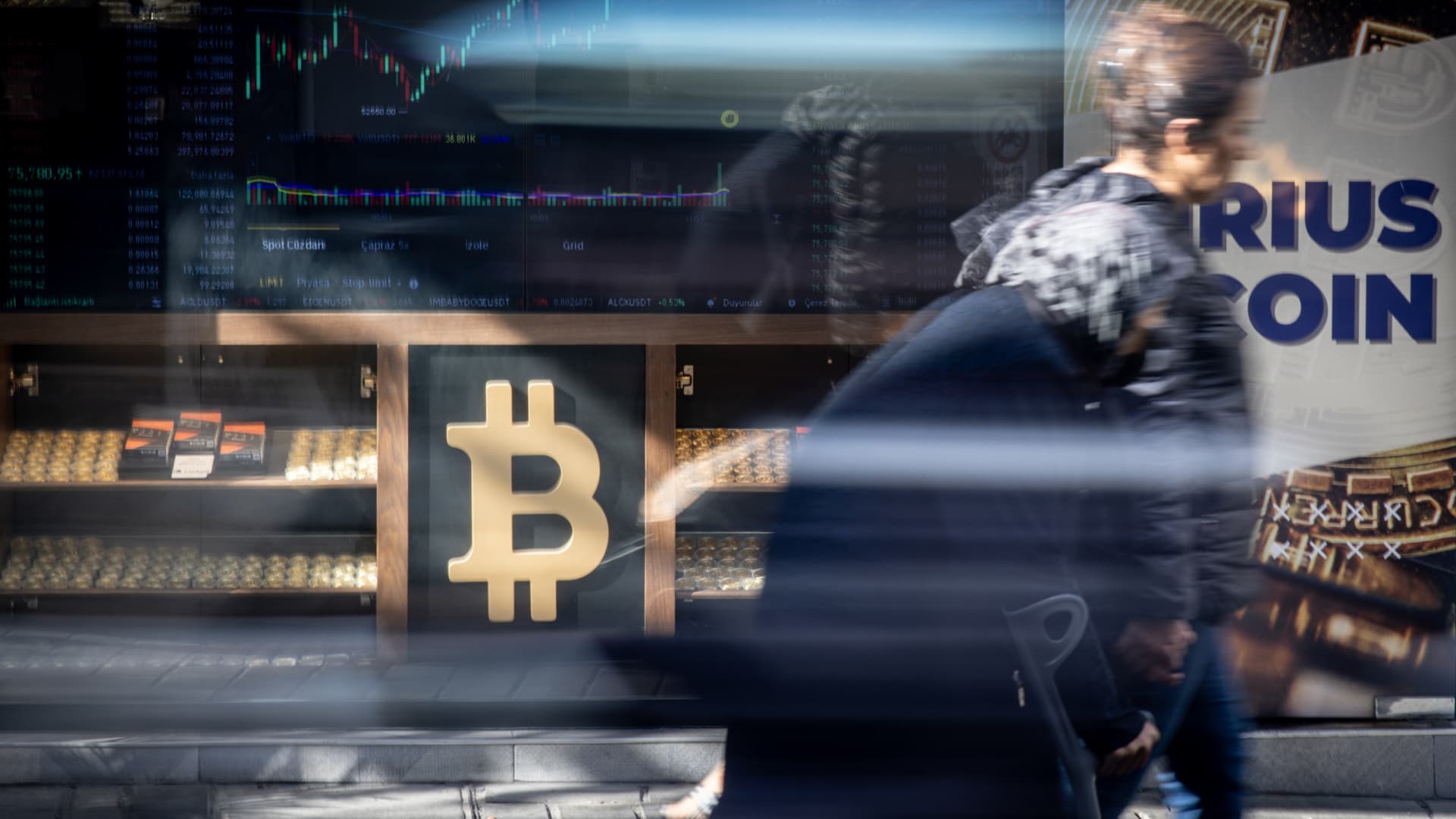 Folks stroll previous the doorway of a cryptocurrency trade workplace on November 08, 2024 in Istanbul, Turkey.