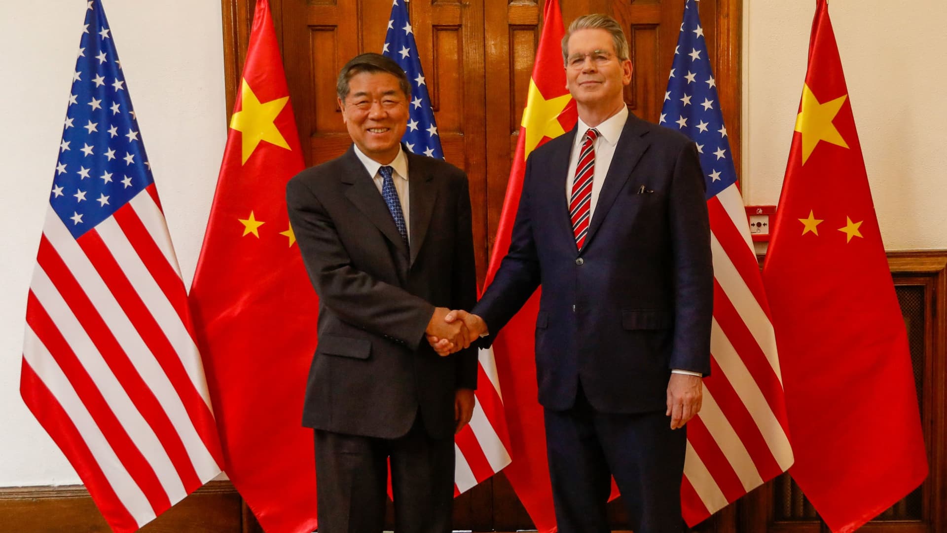 U.S. Treasury Secretary Scott Bessent and Chinese Vice Premier He Lifeng pose during U.S.-China trade and economic talks at Santa Cruz Palace, Spain’s main foreign ministry office, in Madrid, Spain, September 14, 2025.
